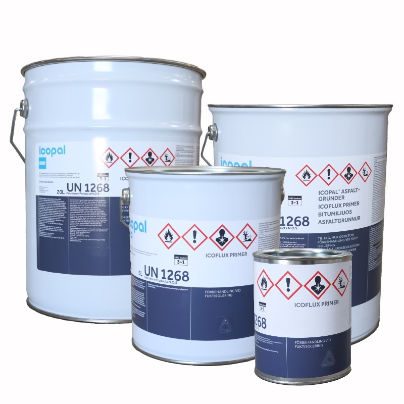Icoflux Primer är en svart asfaltlösning som består av bitumen med tillsats av lösningsmedel, polymerer och klibbförbättrare för optimal vidhäftning. Åtgång ca 0,3 l/m2. Torktid 3-5 timmar vid +20°C. Observera att Icoflux Primer skall omröras grundligt före användning.