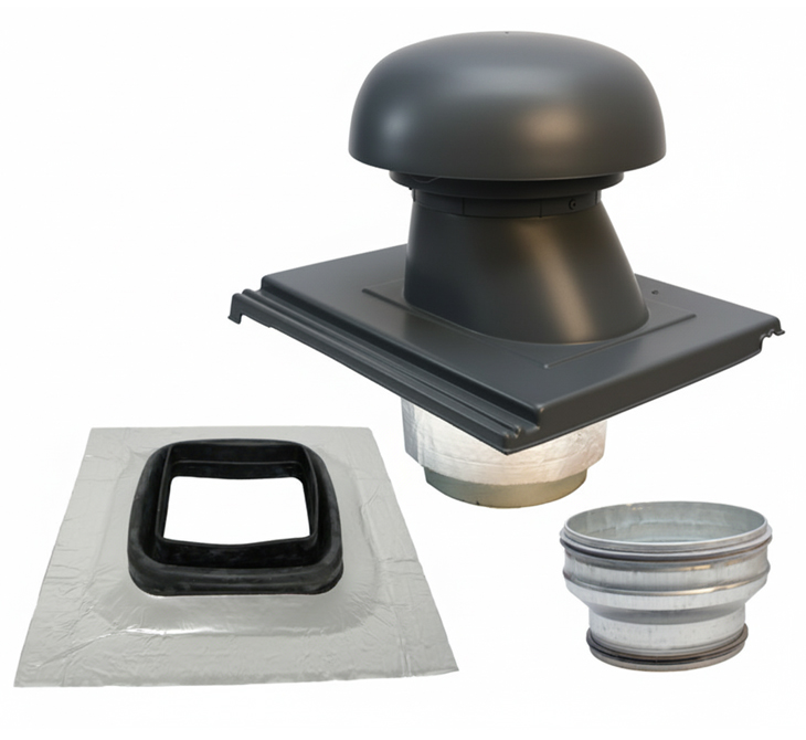 Frånluftshuv Plast Minster Aerlox är anpassad för moderna system med värmeåtervinning där krav på lågt motstånd och litet trycktapp finns. Brandklassad och godkänd för köksfläktsventilation i en- och tvåfamiljshus. Diskret modell, profil och färganpassad till takytan. Ej ställbar. För 14-45 graders taklutning.